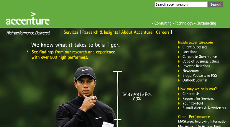 While working at a small marketing services firm called Murphy & Co., I led the design and front-end development of the accenture.com homepage through two redesigns in 2003 and 2005. Bust out your Flash player!