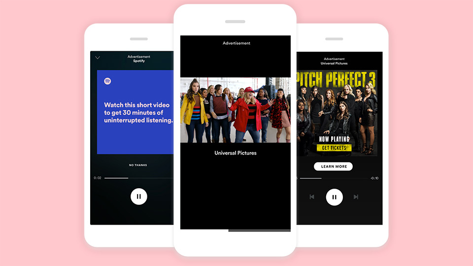 Worked with the ad product team at Spotify to design and prototype "Sponsored Session", now one of their flagship advertising products. Free users are presented with the chance to begin their session by watching a video in exchange for 30 minutes of ad-free listening. Check out video of the latest experience and the original demo from 2014.