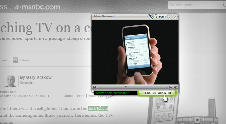 During the early days of online advertising I was able to help Vibrant Media's take their in-text ad product from a yellow box with a hyperlink in it to an immersive, video, branding experience.